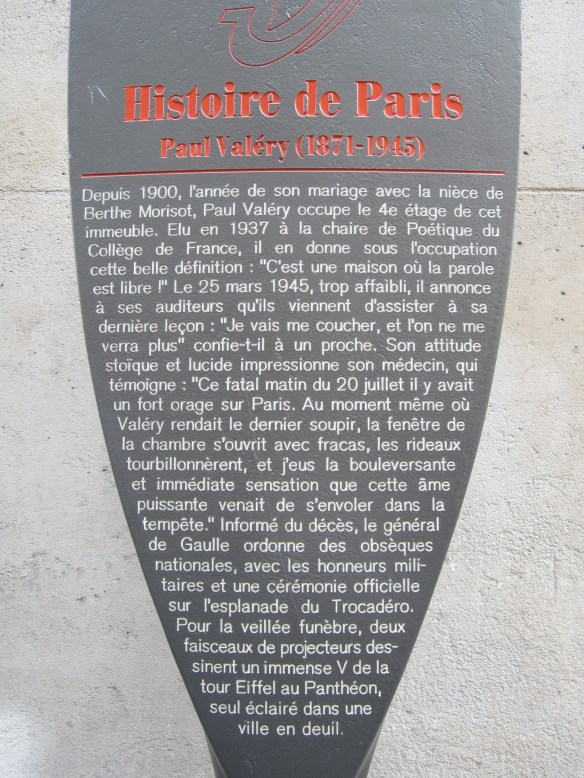 I must admit I was a little disappointed with the historical marker at 40 rue Paul Valéry. Its only reference to Berthe Morisot? Paul Valéry married her niece. That’s it. Every other line is devoted to Valéry.