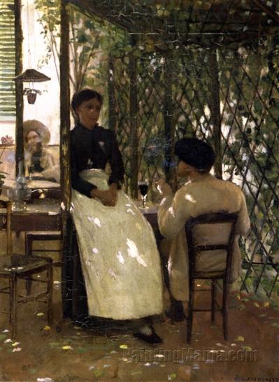 Hotel Chevillon by Sir John Lavery (1883), an Irish artist who visited Grez. This painting captures the feel of the garden at Hotel Chevillon back in the time of Fanny and Louis. Source: http://www.paintingmainia.com